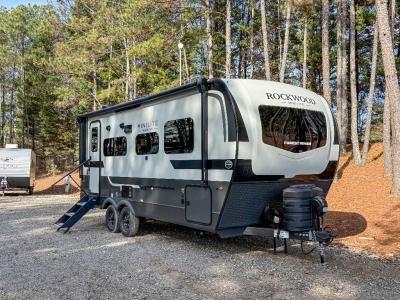 Each Rockwood Mini Lite travel trailer by Forest River is constructed with a fully laminated one-piece walkable roof, sleek frameless windows, and a six-sided full aluminum frame for strength and durability. The 12V thermostatically controlled heated tanks, plus radiant foil in the underbelly will allow you to camp well into the colder months, and the 200W roof solar panel will be perfect for a little off-gridding. Each model includes solid surface kitchen countertops, hidden hinge cabinet doors, roller shades, plus many more interior features. Having an AIR 360+ omnidirectional antenna with WiFi prep on board gives you the option to get some work done if it's needed, and the power tongue jack provides hassle-free set up, so you can enjoy more time relaxing!