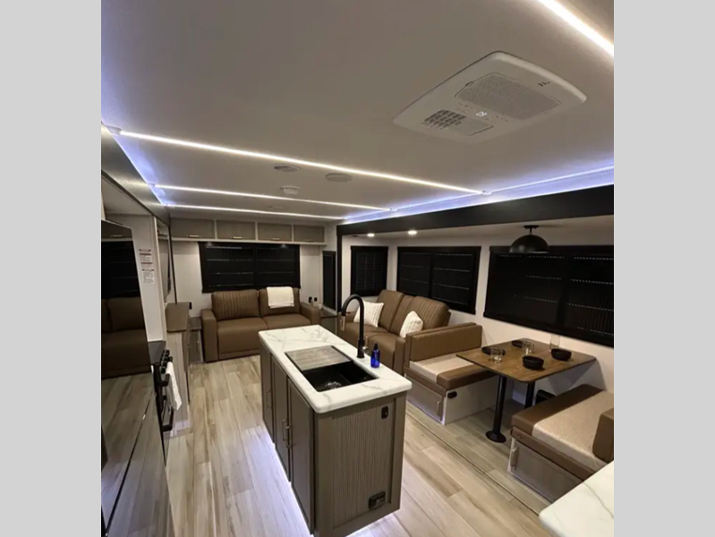 Sleeps 3 Slides 2 Length 33 ft 1 in Ext Width 8 ft Ext Height 11 ft Hitch Weight 1160 lbs Dry Weight 8243 lbs Cargo Capacity 1717 lbs Fresh Water Capacity 49 gals Grey Water Capacity 90 gals Black Water Capacity 30 gals Available Beds Custom King Refrigerator Type 12V Refrigerator Size 10 cu ft Cooktop Burners 3 Number of Awnings 1 Water Heater Type On Demand Tankless AC BTU 31500 btu TV Info LR 50" LED Smart TV Awning Info 19' with LED Lights Axle Count 2 Washer/Dryer Available Yes Shower Type Radius Electrical Service 50 amp Similar Floorplans