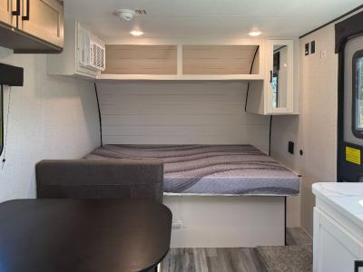 You'll find fresh interior décor and the modern technology that has been included will keep you running smoothly throughout your trips. The Magnum Truss roof system has been engineered to withstand 4,500 pounds of pressure which will help you feel safer during wind or snow storms. Each trailer includes a 200W solar panel for off-grid capabilities, and the American-made Goodyear tires allow you to tow with confidence. Dark tinted windows give you added privacy and the linoleum throughout will be easy to clean!