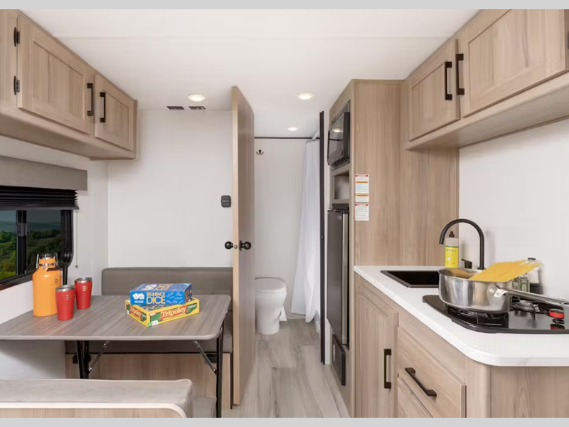 Sleeps 5 Length 20 ft 5 in Ext Height 9 ft 9 in Int Height 6 ft 6 in Hitch Weight 398 lbs Dry Weight 3071 lbs Cargo Capacity 1229 lbs Fresh Water Capacity 21 gals Grey Water Capacity 34 gals Black Water Capacity 34 gals Tire Size ST215/75R14D Furnace BTU 20000 btu Number Of Bunks 2 Available Beds Queen Refrigerator Type 12V Refrigerator Size 3.3 cu ft Cooktop Burners 2 Number of Awnings 1 LP Tank Capacity 20 lbs Water Heater Type Tankless Awning Info 8' Power Axle Count 1 Number of LP Tanks 1 Shower Type Standard Similar Floorplans