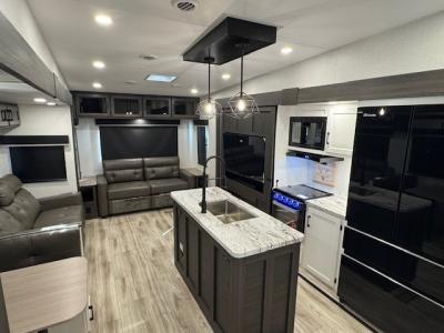 At the front of the fifth wheel, you’ll find a private bedroom designed for rest and relaxation, featuring a 60" x 80" Sleep Tight queen bed and a spacious slide-out wardrobe, with additional wardrobes on each side for all your clothing and essentials. Down the hall, the full bathroom offers residential comfort with a 30" x 36" shower with glass slider door, a porcelain foot-flush toilet, and an oval stainless-steel sink. In the center and rear, the open living and kitchen area features dual opposing slides for generous floor space. The fully equipped kitchen includes a pantry, three-burner range with flush-mount glass cover, 21" oven with air fryer, microwave, and a large 18 cu. ft. refrigerator, plus a center island with sink and added counter space. Nearby, a desk and hutch provide versatility for work or storage, while the table with chairs and Versa benches and theater seating make it easy to dine or relax. At the rear, a 70" tri-fold sofa offers the perfect spot to unwind and easily converts into extra-sleeping space when needed.