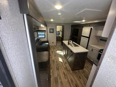 Versatility abounds in this travel trailer! The rear private bunkhouse has a set of 32" x 70" bunk beds and a set of 28" x 70" flip up bunk beds, but what is really special about this room is its ability to convert to a flex room with a desk, king bed, extra storage or a pet palace. The chef will enjoy having their choice of either cooking indoors with the kitchen island and three burner cooktop or cooking at the exterior campfire café with a refrigerator, a griddle, and a sink with countertop space. Relax each night in true comfort with a 70" tri-fold sofa across from the entertainment center with a 30" frameless fireplace, plus the front private bedroom has a 30" frameless fireplace across from a 60" x 80" queen bed slide. You can even transform the sofa and the Sit N' Slide table into extra sleeping spaces. The bedroom also has a window seat so you can look out at your beautiful scenery while reading a book and an interior wall wardrobe with washer and dryer prep!